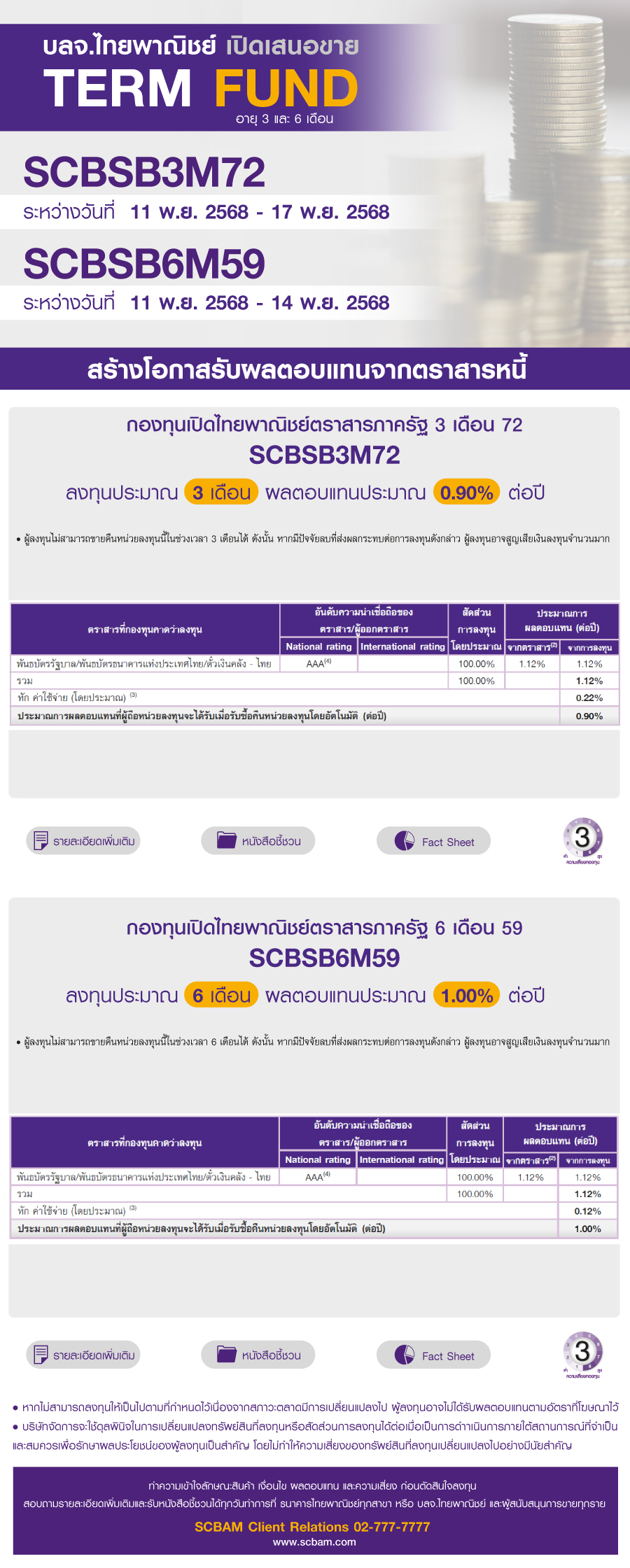 SCBAM launches SCB Sovereign Bond 3M72 (SCBSB3M72) offering during 11 – 17 NOV 2025 and 6M59 (SCBSB6M59) offering during 11 – 14 NOV 2025