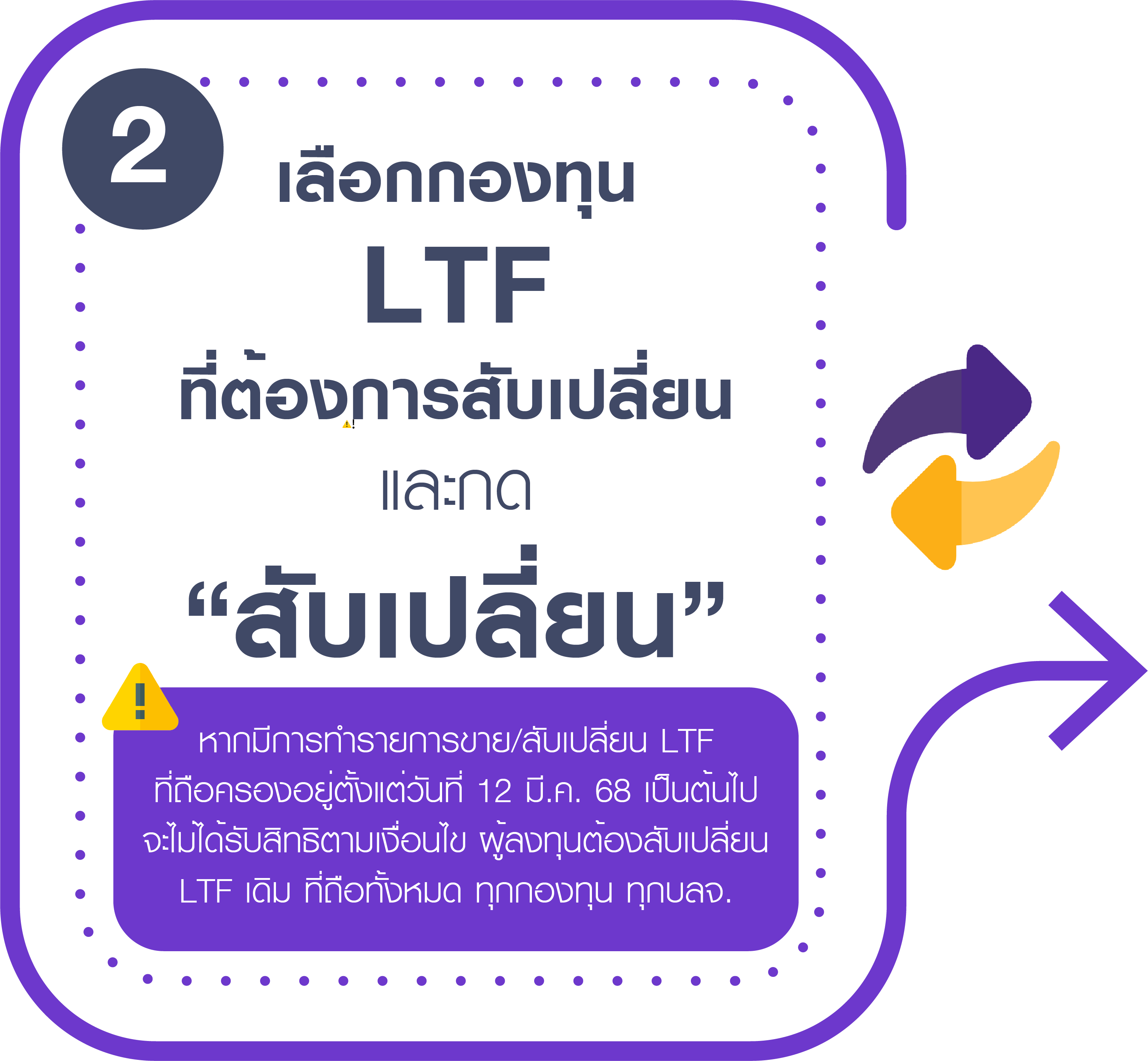 • หากมีการทำรายการขาย/สับเปลี่ยน LTF ที่ถือครองอยู่ตั้งแต่วันที่ 12 มี.ค. 68 เป็นต้นไปจะไม่ได้รับสิทธิตามเงื่อนไข