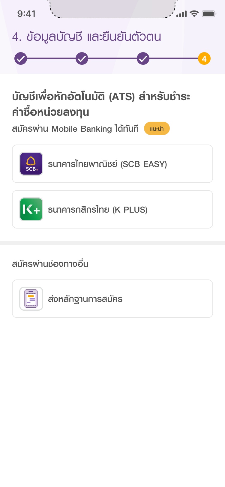 - สำหรับผู้ลงทุนที่ได้เคยเปิดบัญชีผ่านตัวแทนจำหน่ายต่างๆของบลจ. เช่น สาขาธนาคารไทยพาณิชย์ หรือ บริษัทหลักทรัพย์ (โบรกเกอร์) หรือ บริษัทหลักทรัพย์นายหน้าซื้อขายหน่วยลงทุน (บลน.) อื่นๆ จะต้องเปิดบัญชีใหม่