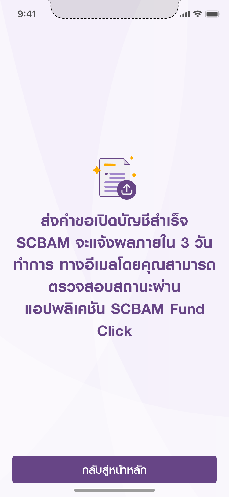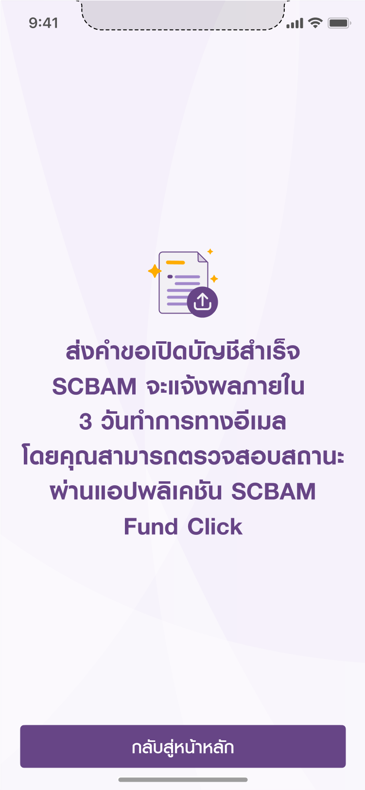 บลจ. จะแจ้งผลทางอีเมล ภายใน 3 วันทำการ และท่านสามารถตรวจสอบสถานะใบสมัครผ่านแอปพลิเคชัน SCBAM Fund Click