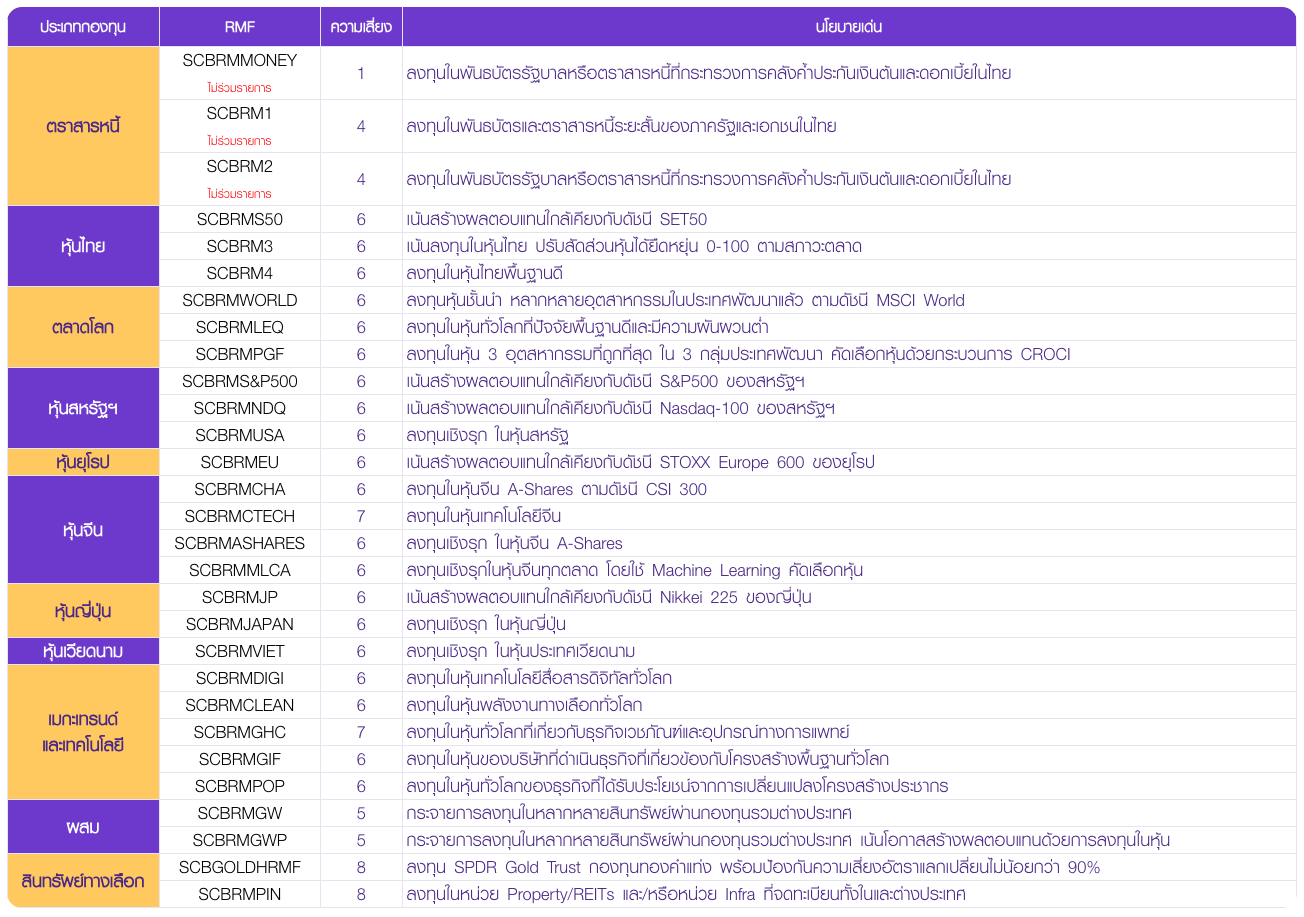 | หุ้นไทย | SCBRMS50 | 6 | เน้นสร้างผลตอบแทนใกล้เคียงกับดัชนี SET50 |
