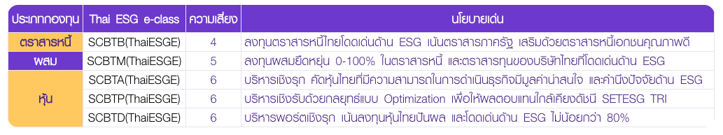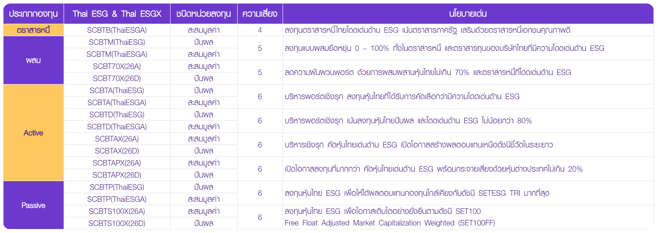 | Active | SCBTA(ThaiESG) | ปันผล | 6 | บริหารพอร์ตเชิงรุก ลงทุนหุ้นไทยที่ได้รับการคัดเลือกว่ามีความโดดเด่นด้าน ESG |