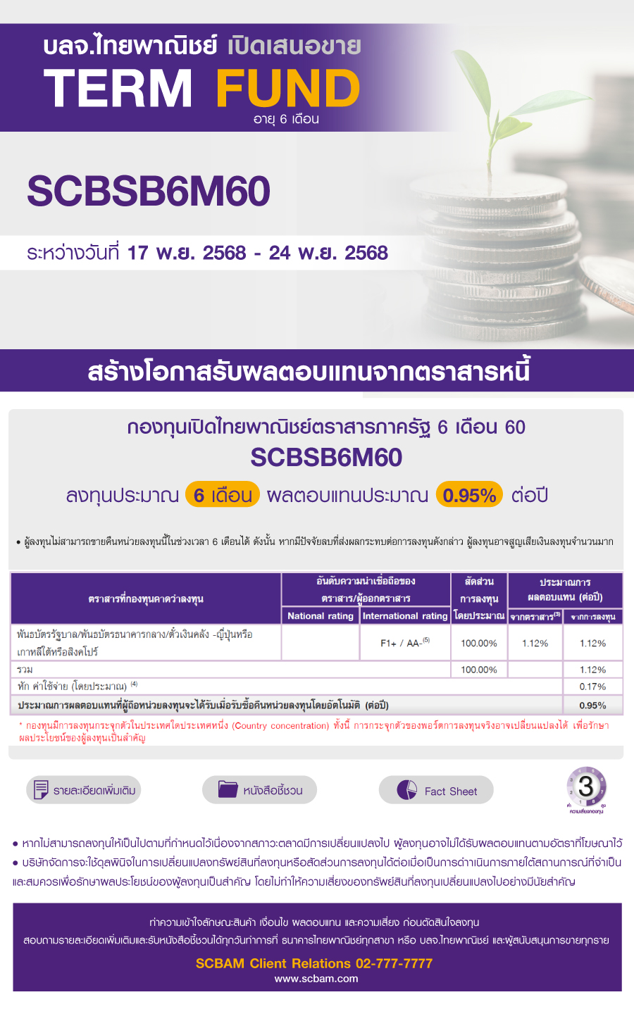 เปิดเสนอขายกองทุนเปิดไทยพาณิชย์ตราสารภาครัฐ 6 เดือน 60 (SCBSB6M60) ระหว่างวันที่ 17 พ.ย. 68 – 24 พ.ย. 68