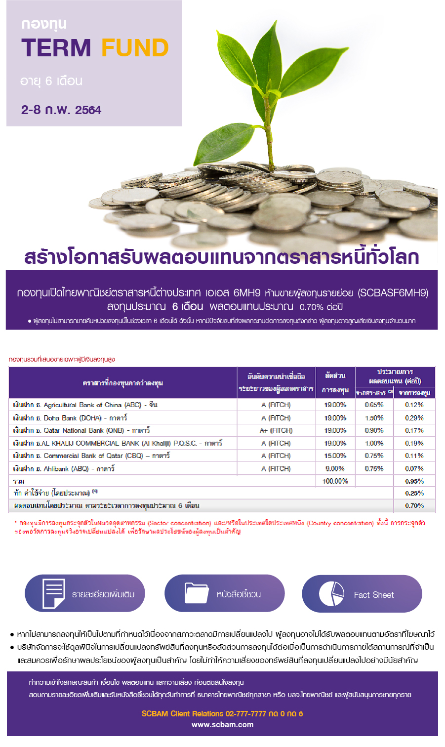 1. กองทุนเปิดไทยพาณิชย์ตราสารหนี้ต่างประเทศ 6MH9ห้ามขายผู้ลงทุนราย (SCBASF6MH9)